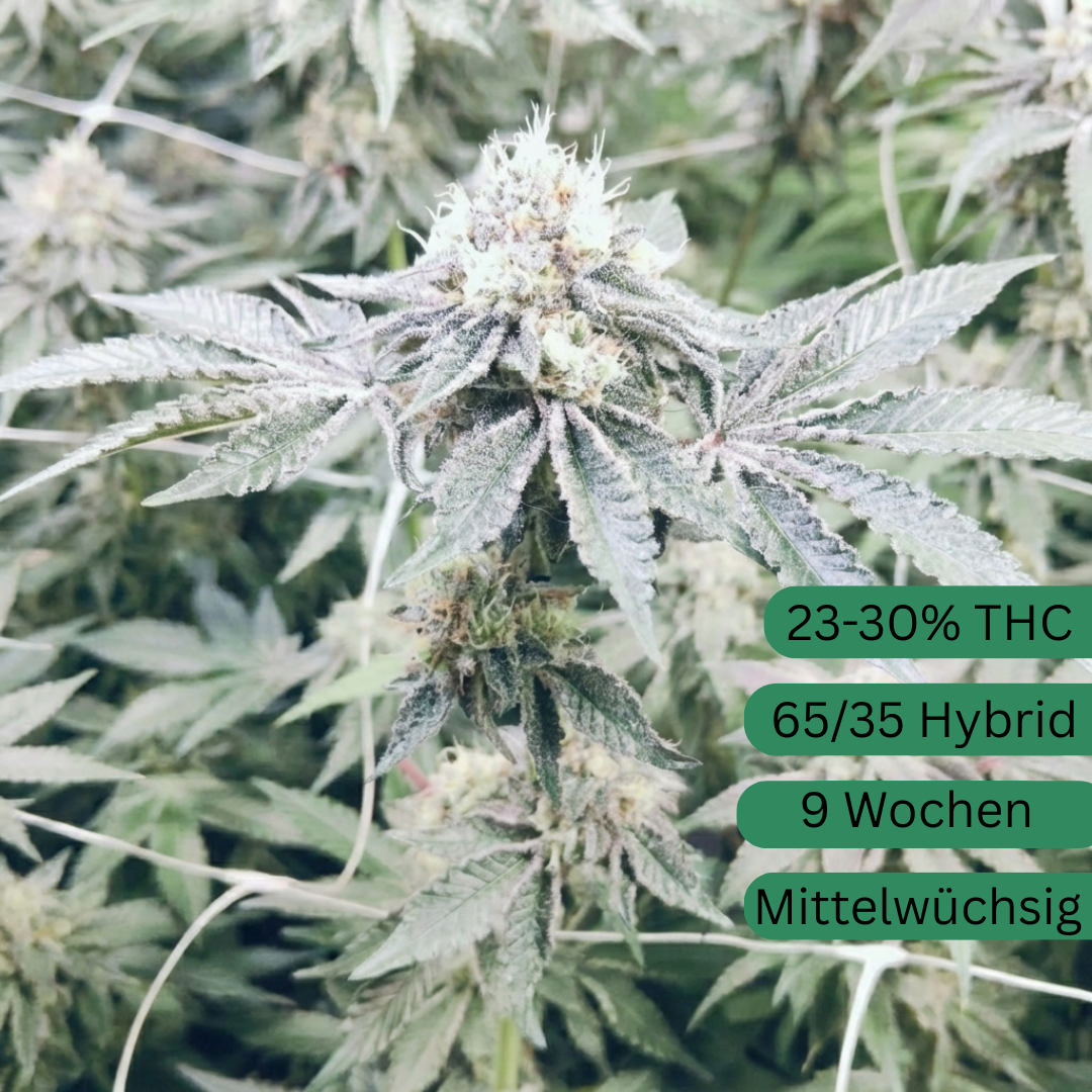 Vanilla Frosting (A.K.A Vanilla Frosting) je hybridní odrůda s dominantní sativou, vzniklá zkřížením Gelato x Frost OG, s poměrem přibližně 60 % sativy a 40 % indiky. Odrůda má dobu květu přibližně 9–10 týdnů a dosahuje střední výšky, díky čemuž je ideální pro pěstování v interiéru i exteriéru. Vizuálně zaujme hustými květy pokrytými pryskyřicí a obzvláště výraznou trichomovou vrstvou, která podtrhuje její prémiovou kvalitu. Chuťově nabízí intenzivní sladké vanilkové aroma v kombinaci se silnými, mírně dieselovými tóny, přičemž terpenový profil zajišťuje dlouhotrvající, aromatický zážitek. Obsah THC se pohybuje kolem 23–30 %, což vede k rychle nastupujícímu, euforickému účinku, který následně přechází v příjemnou fyzickou relaxaci a silný pocit pohody.